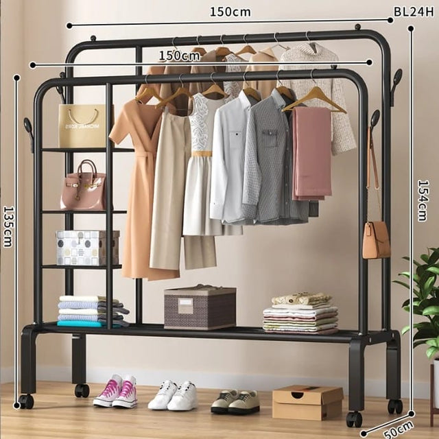New Design Double pole cloth rack with lower and side storage for shoe and boxes. Has with wheels