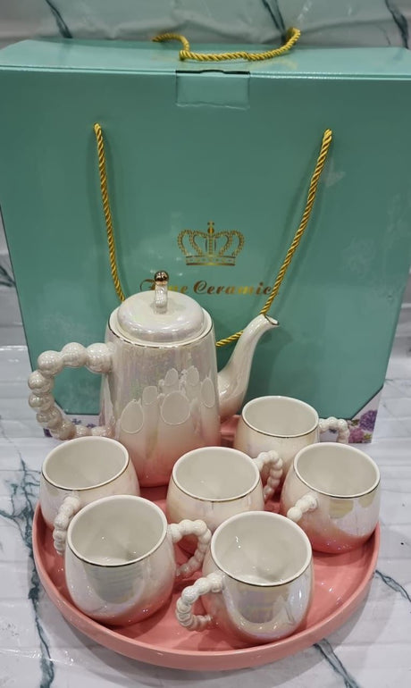 Fine ceramic 8pc Rotating tray tea set with 6 cups and kettle