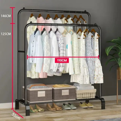 Straight Double Clothes Rack with 2 Bottom Shelf Storage Organizer Space & has Side Hooks