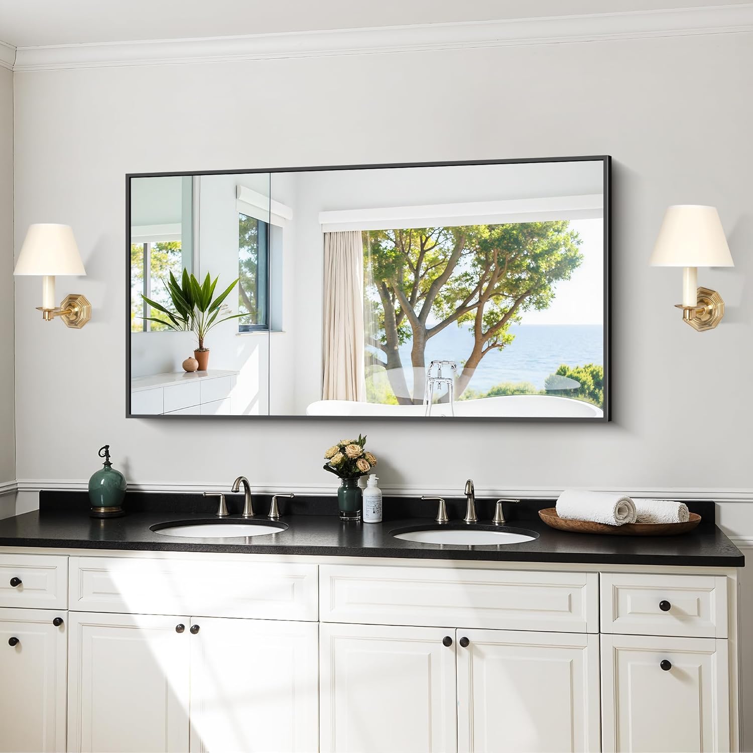 An ideal contemporary mirror for wall decoration with metal frame, very classic, perfectly goes with any decor, suitable for using in bathroom, dressing room vanity, hallway, bedroom, living room, entryway, fireplace. A great decorative wall mirror choice